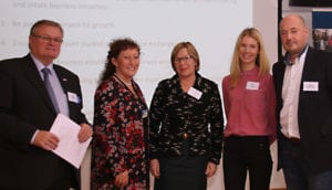Viktige aktører på seminaret på BI. Fra venstre står Rolf Hauge (NOFI-Oslo), Gillian Warner-Søderholm (BI), Erja Karhonen (Finlands ambassade), Lise Larsen (NOFI-Helsingfors) og Klas Blomqvist (NOFI-Helsingfors).